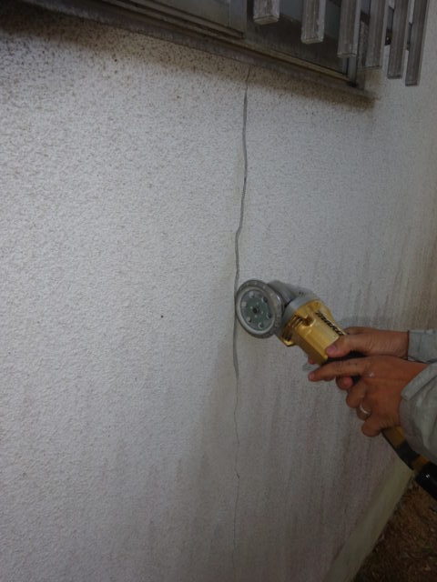 外壁にヒビ(クラック)が入っている箇所にV型にカットして左官にて溝を埋めます。
